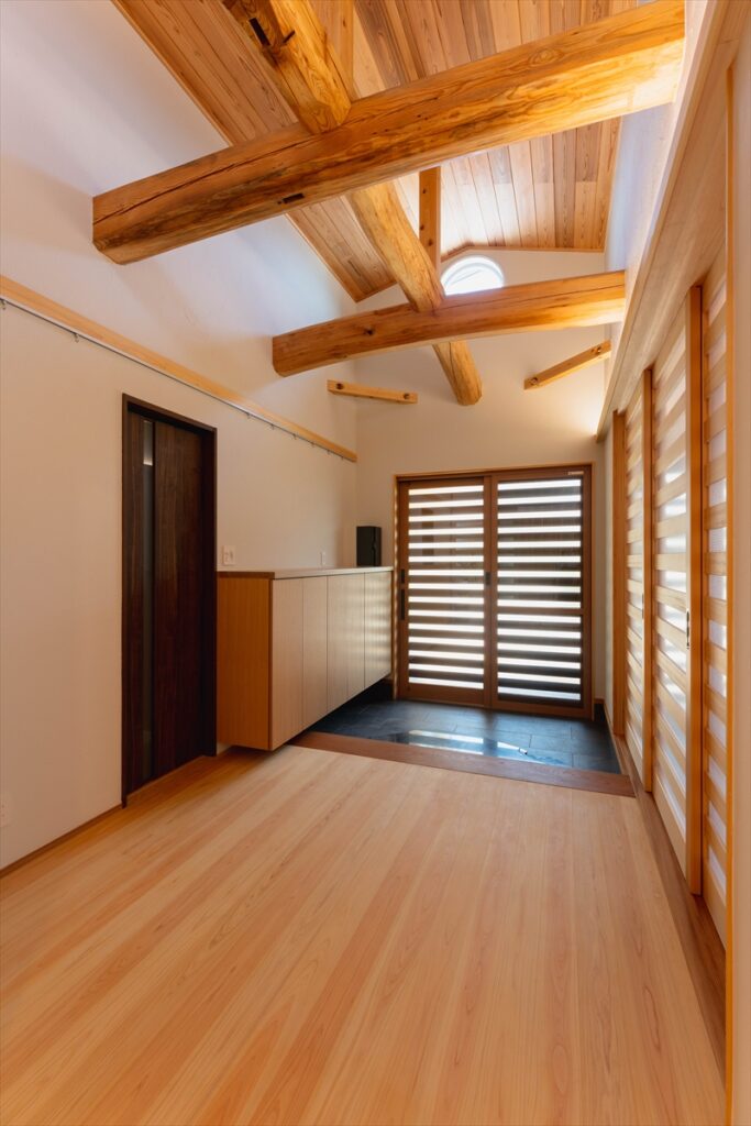 ヒノキや欅の無垢材、珪藻土など自然素材がたっぷり使われているT様のお住い。玄関を開けた瞬間に心地ちょい香りが広がり、寄棟屋根の形状を活かした開放的な大空間に圧倒されます。壁や天井にも無垢材を使用、窓からは明るい日差しが差し込み、森の中にいるような爽快感を味わえます。