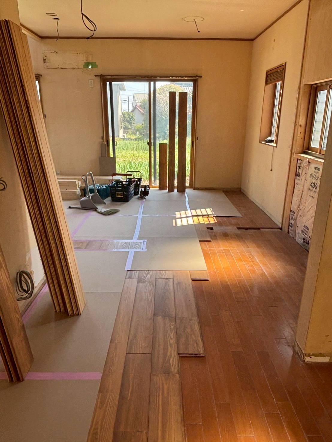 無垢床を一枚一枚張っては養生を重ねていきます。 -