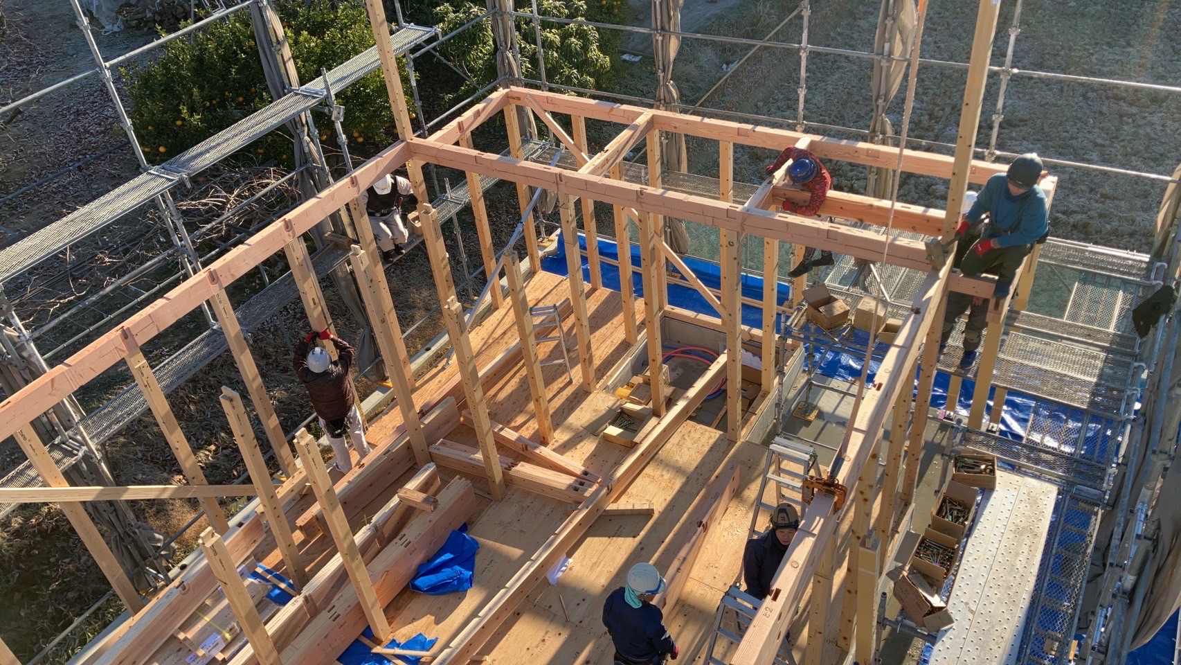 1日で、2階の屋根の下の棟木までを取り付ける上棟。大勢の大工さんが集まり、一気に作業を行います。