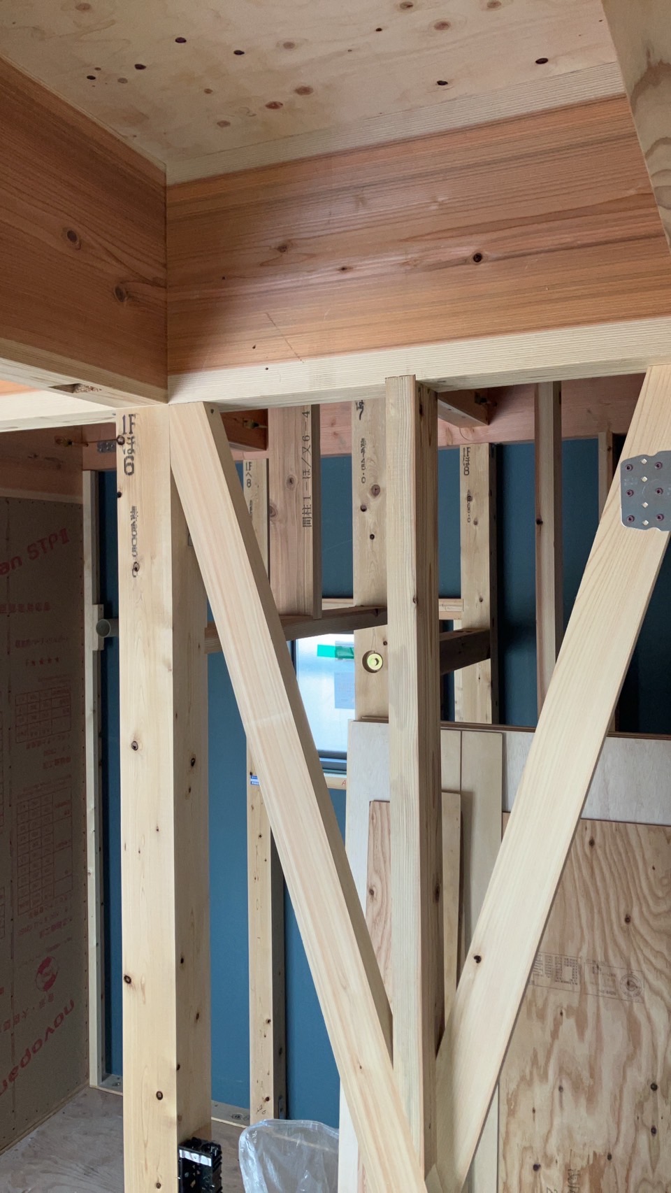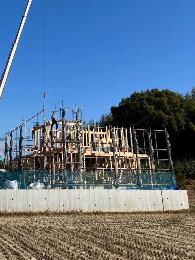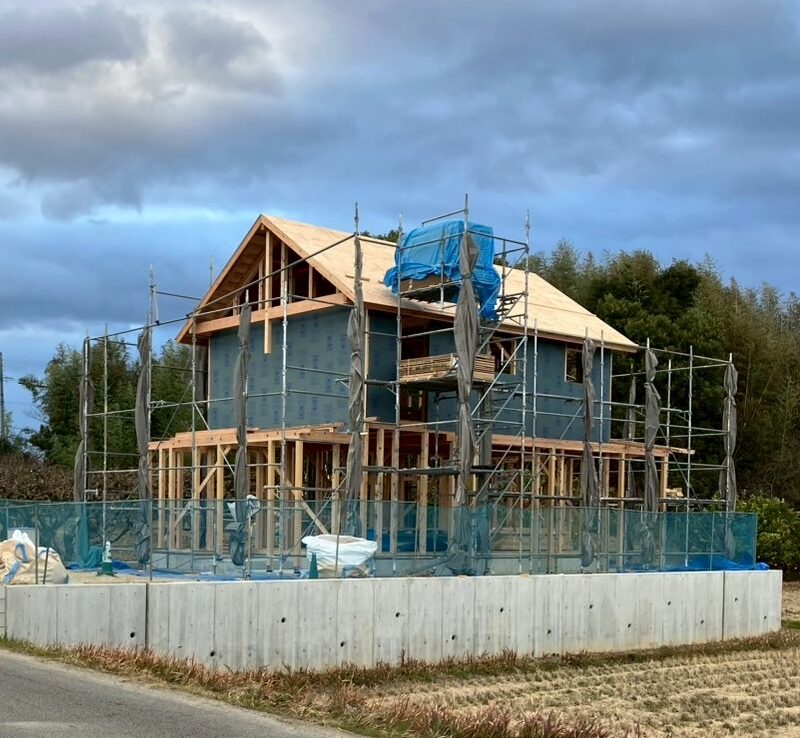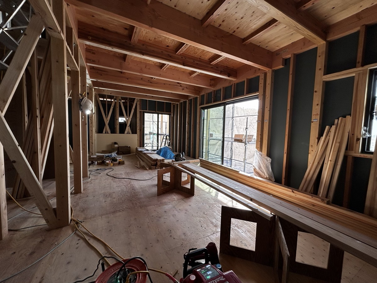 1日で屋根の板や石膏ボードまで取り付けることができました。これからは屋根・外壁工事、室内の大工工事が進んでいきます。