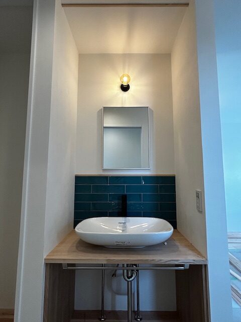 深いブルーのタイルを貼った2階の造作洗面。トイレ後の手洗いはもちろん、2階に洗面があると身支度や掃除にも便利です。 -