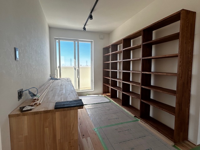 2階のフリースペースに、仕事ができるスペースを。背面には一面に本棚を設置し、お仕事をする隣でお子様も勉強をしたり本を読んだりできます。 -