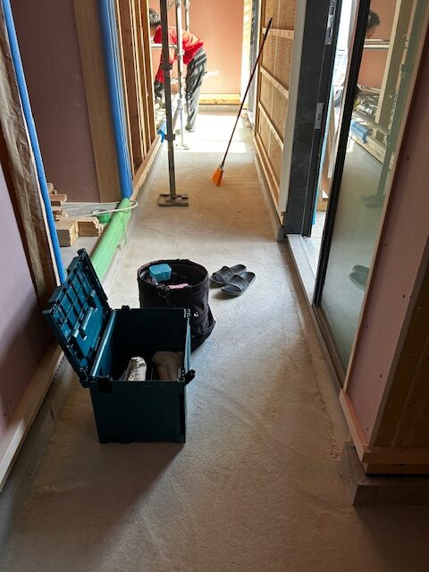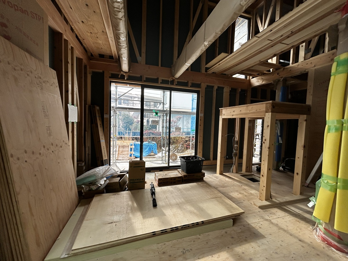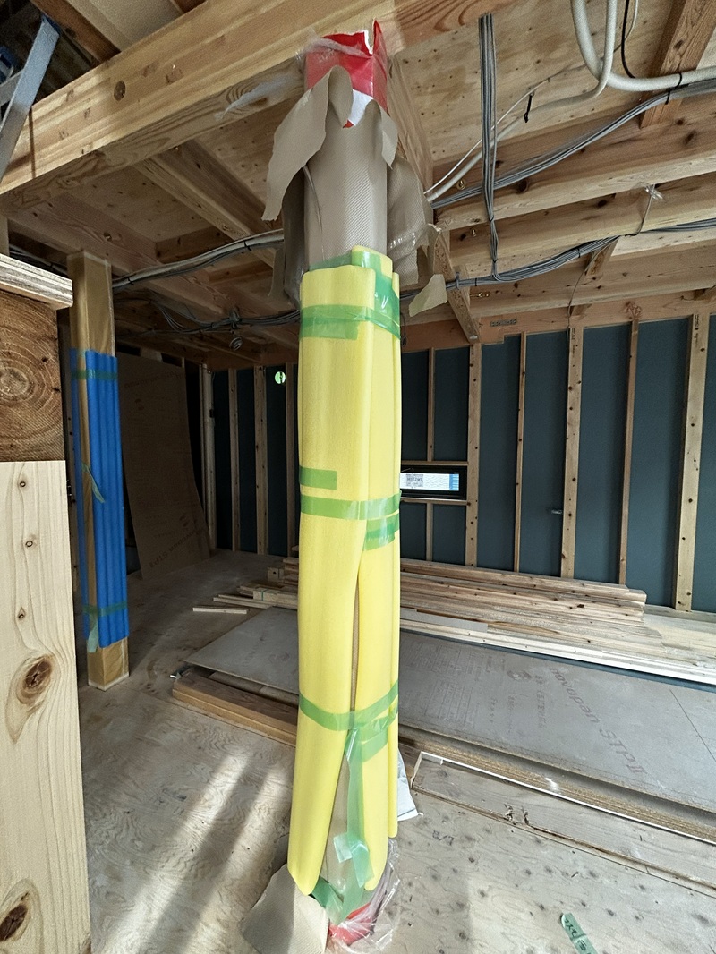 LDKの中心には八角形の大黒柱があります。大工工事中は養生がしてあり分かりにくいですが、存在感があります。 -