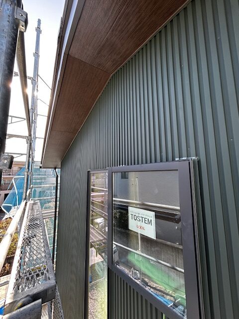 グリーンのガルバリウム外壁とダークブラウンの軒天のコントラストが素敵な外観。軒天にこだわると、住まいの印象がずいぶん変わりますね。 -