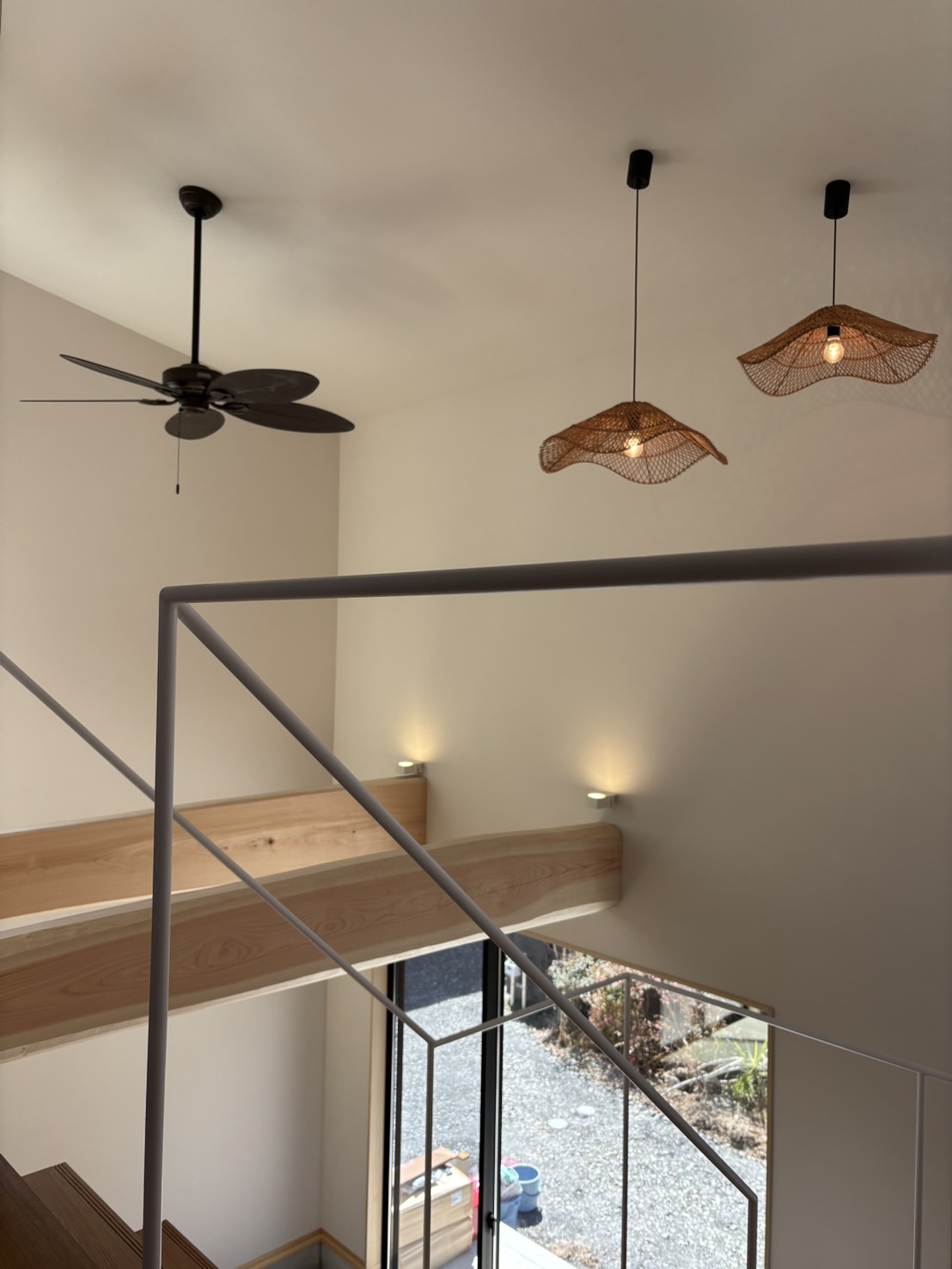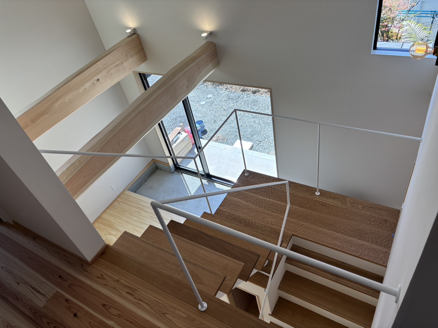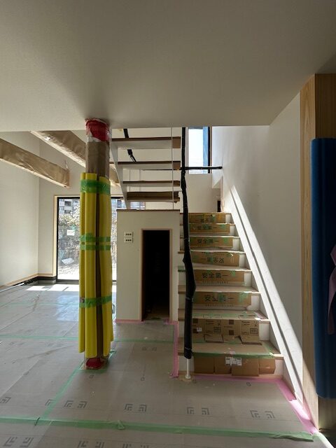 養生がしてあり分かりにくいですが、階段の手すりはアイアン、踊り場はスプーンカットの無垢板を採用しています。踊り場付近には、コンセントも設置しており、暮らしてからの様々な用途に対応できるようにしています。 -