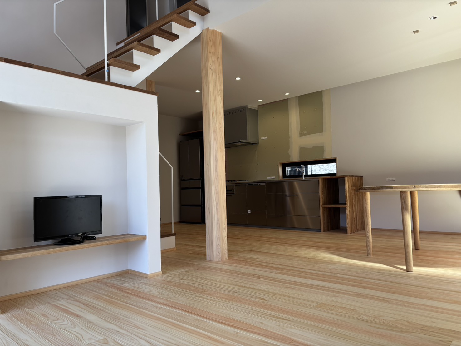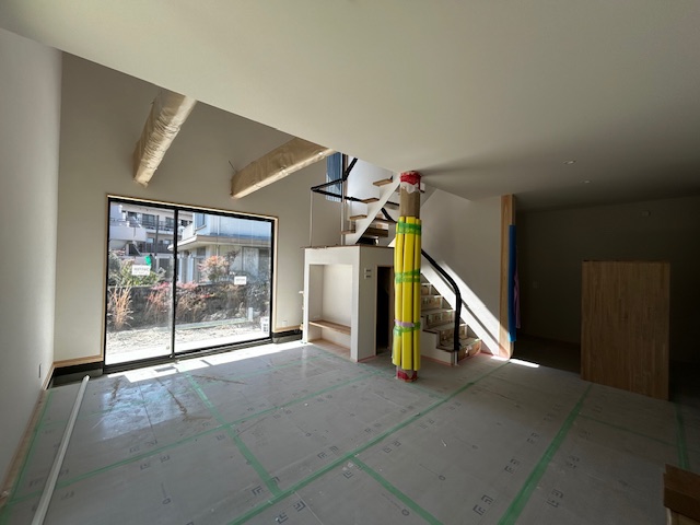 太い梁がそびえる吹き抜けのLDK.。写真右側のボックスのような空間には階段を設えます。 -