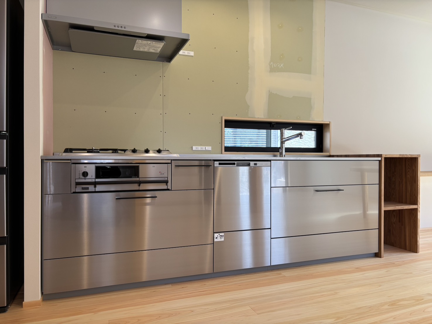 ステンレスのシステムキッチン。キッチン前の壁には、施主様お気に入りの作家さんのタイルをご自身で貼られる予定です。 -