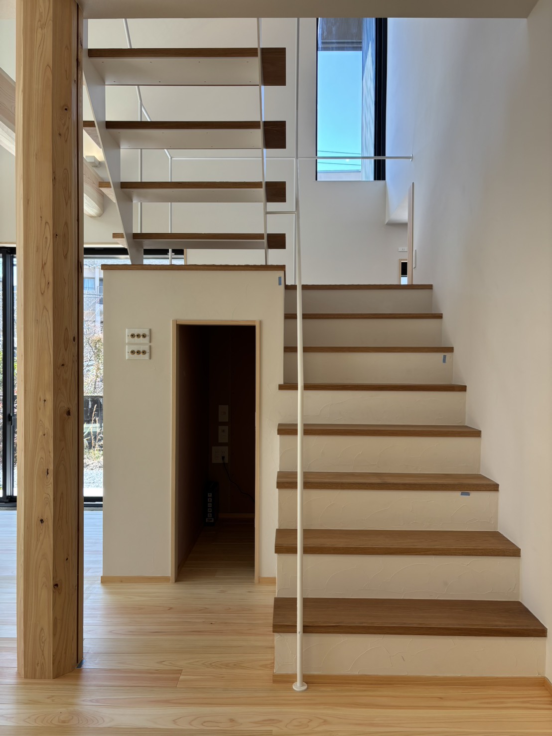 階段下は収納に、正面の窓から光を取りこむ、機能的な階段。階段の板はタモの無垢材を使用しています。 -