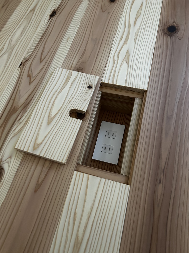 寝室の床にあるコンセント。間接照明を置くために配線が目立たないよう、床に設置しました。 -