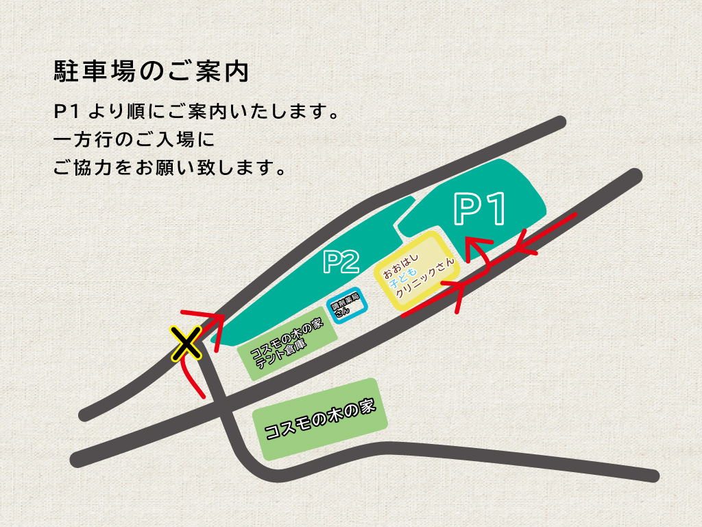 なお駐車場は、コスモの木の家向かいの、おおはし子どもクリニック様、調剤薬局様、その裏のスペースをご利用いただけます。