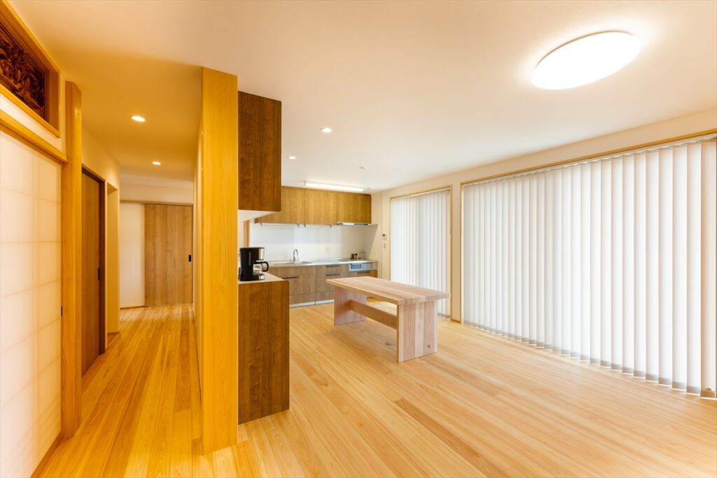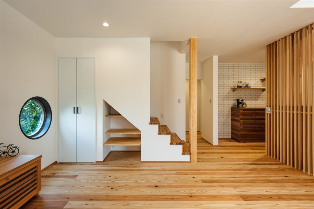 リビングの中心は柔らかいヒノキやスギにして、玄関〜廊下だけ土足対応の硬め樹種を組み合わせる「ゾーニング」もおすすめですよ。