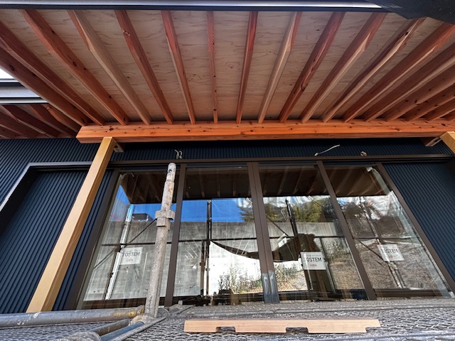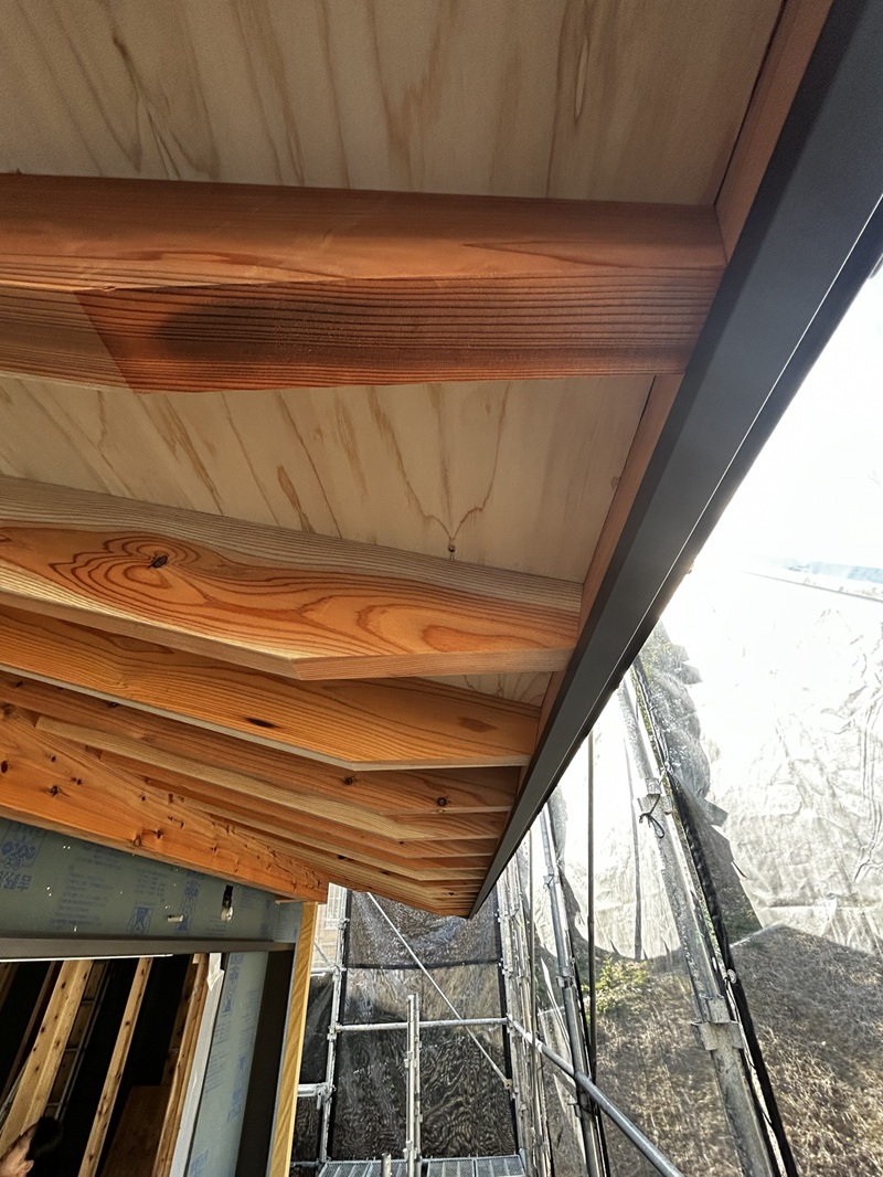 裏のデッキの上には、リビングからつながる垂木が露わになっています。太い垂木の軒先を少しカットすることで、スタイリッシュなデザインになります。 -