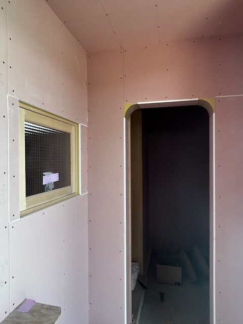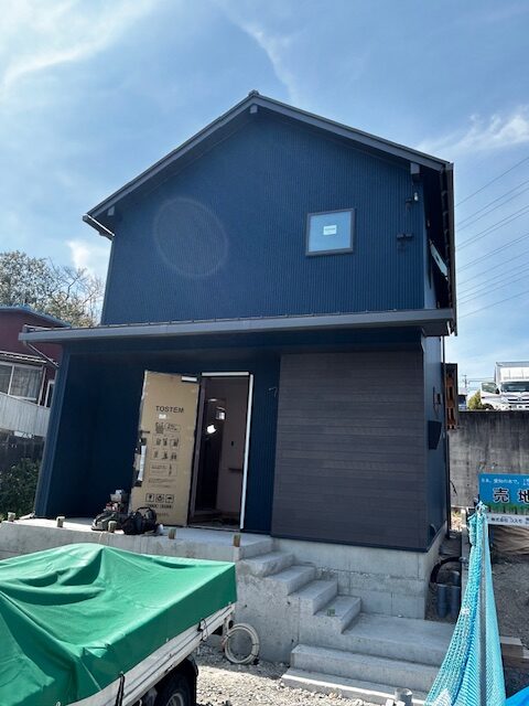 深い海をイメージさせる、ダークブルーのガルバリウム外壁。足場が外れて、全体が見える日が待ち遠しいです。 -