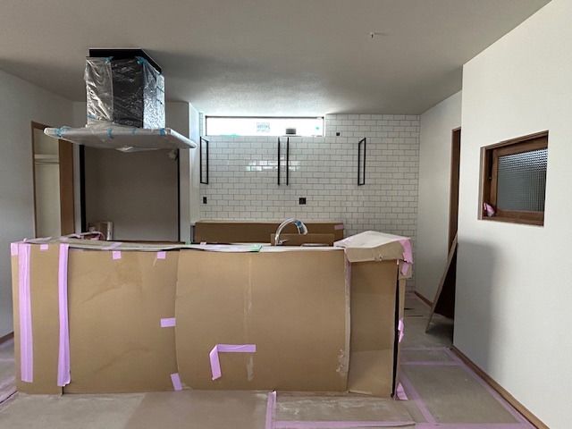 キッチン(未設置)からはLDK全体が見渡せ、お風呂への動線もスムーズ。玄関からも直接つながり、荷物の運搬もラクラクです。 -