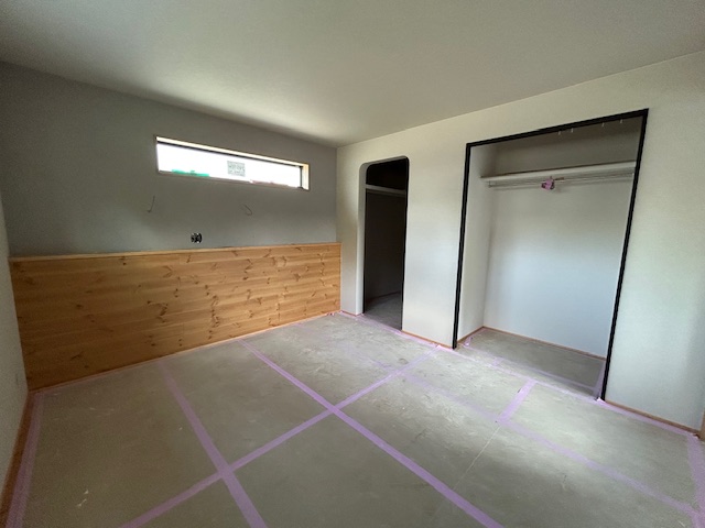 寝室の壁には、無垢材で設えた腰壁を設置。木の香りに包まれて眠ることができ、安眠を促してくれるかもしれませんね。 -
