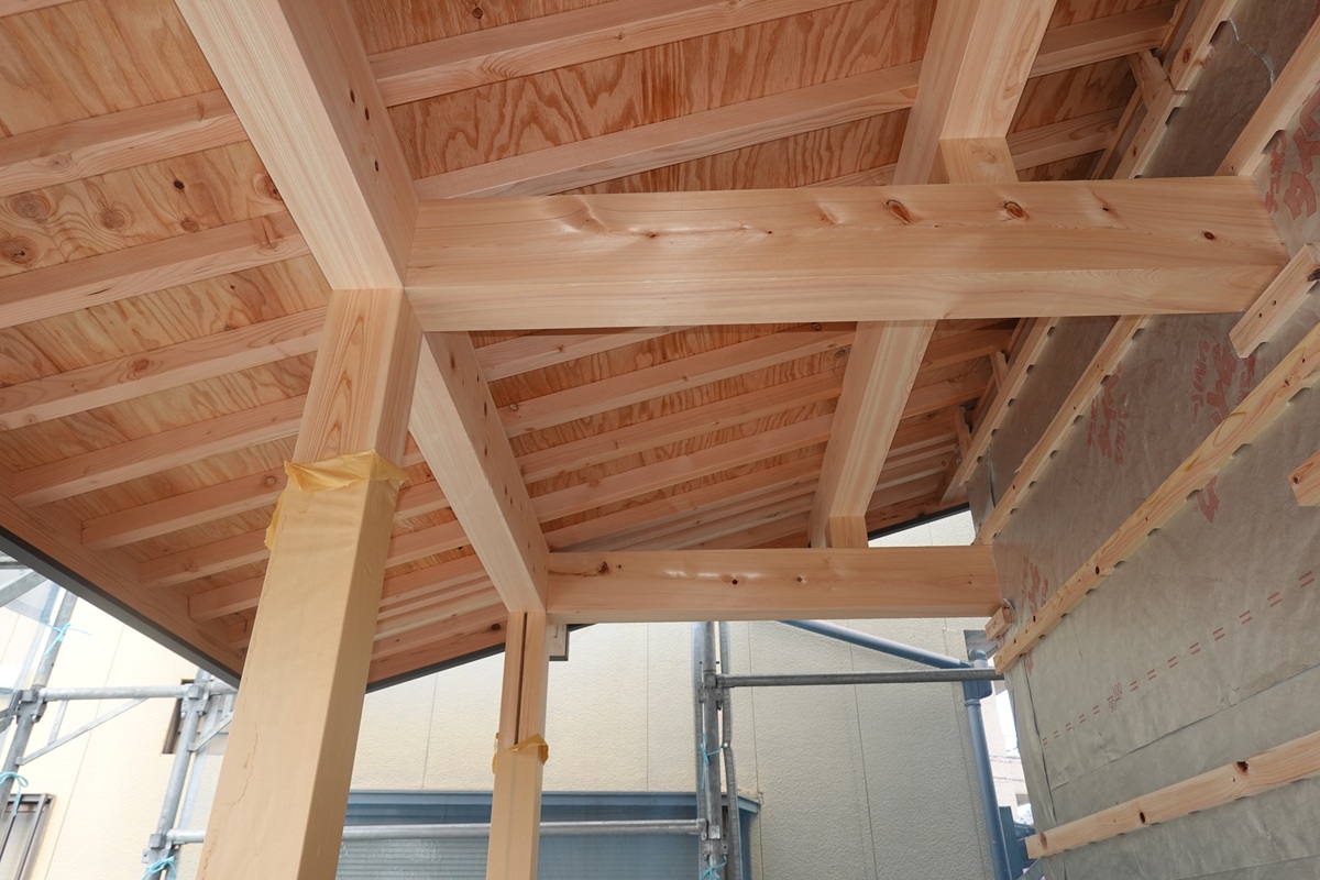 玄関口の軒天。むき出しになる柱と梁の美しさ。愛知の木ならではの輝きです。