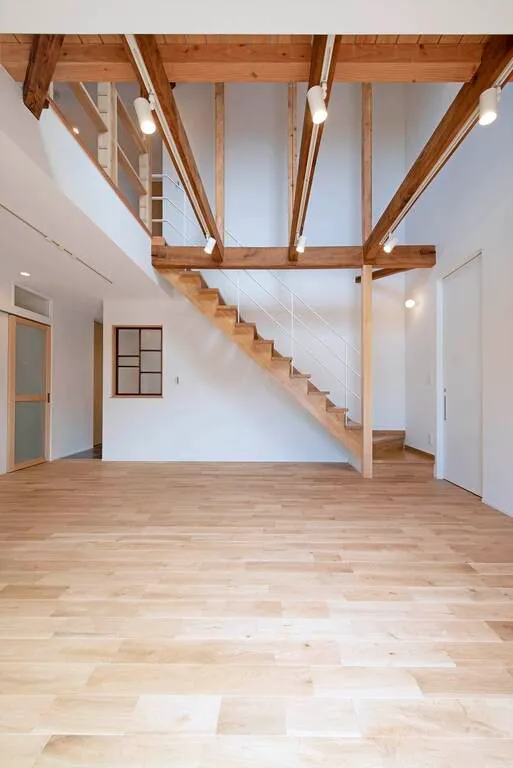 古い梁を残してリノベーション、古い梁を取り入れた新築