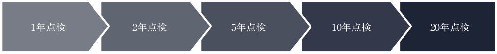定期点検では点検箇所・点検方法などの説明をさせていただき、室内・玄関の点検や外壁の状況、配管の水漏れの確認など、プロ目線で目の届きにくい箇所まで点検いたします。点検するタイミングは下記5回となります。