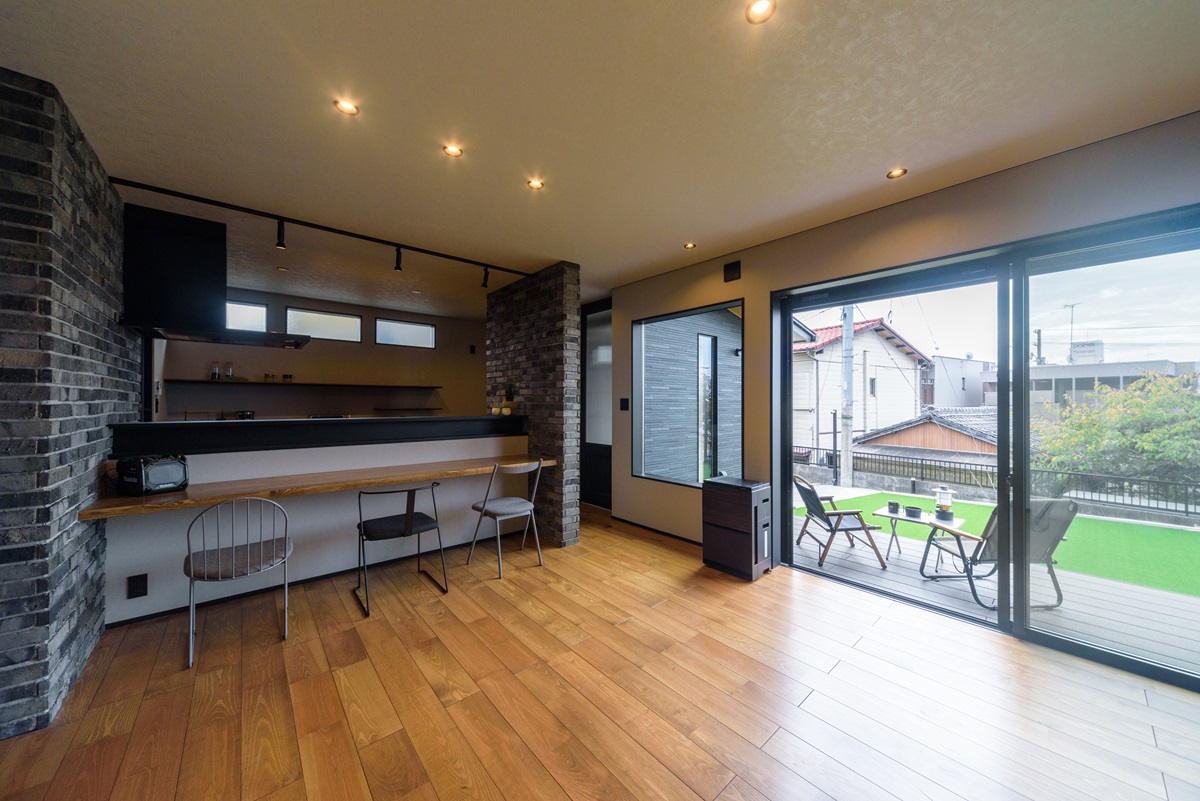 広々としたウッドデッキと人工芝のお庭が広がる暮らし。