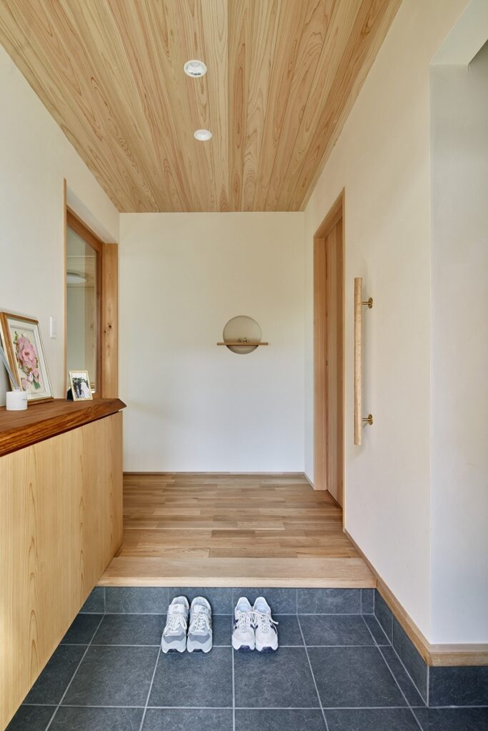 玄関の天井は板張り、靴箱は造作、靴箱の天板には一枚板を採用しています。本物の木に包まれた玄関は、扉を開けた瞬間に心地よい木の香りに包まれます。