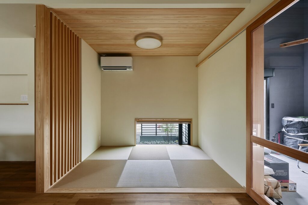 地窓から坪庭をながめられるリビングの一角に配した畳コーナー。ごろんと寝転んでくつろいだり、座卓を置いてお客様をもてなしたり、日常も非日常も演出できる空間です。リビングからはバイクガレージにもつながり、道具のお手入れや物の出し入れにも便利です。