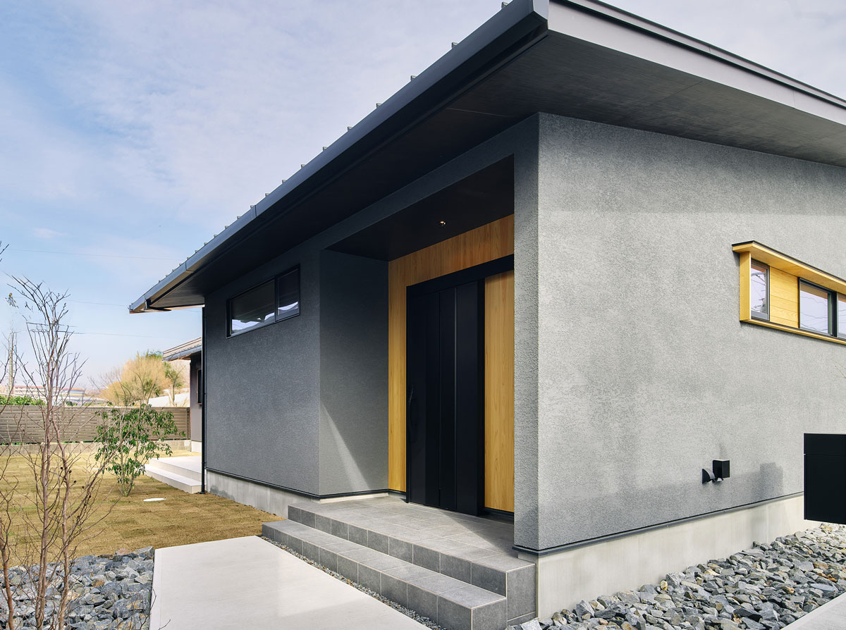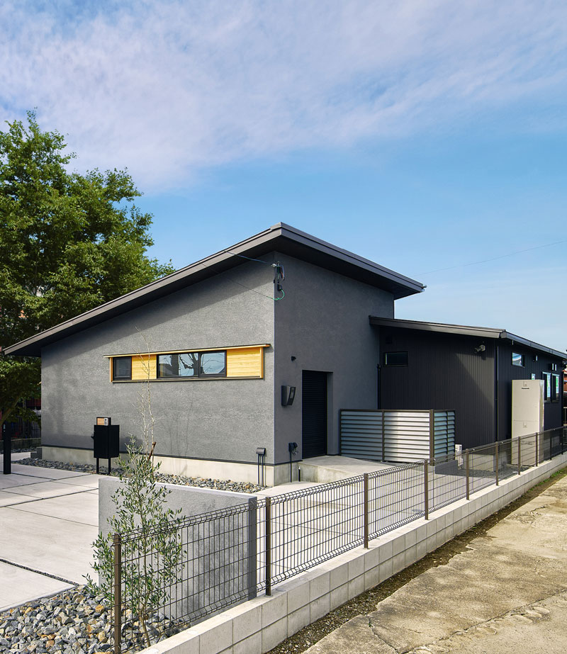 グレーの外壁が落ち着いた印象を放つ平屋の住まい。トイレの窓とガレージの窓を活かして、木の板を貼り外観のアクセントに。また通りに面した立地のため、玄関は建物の南側に設計しプライバシーに配慮しています。