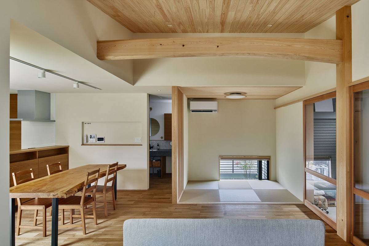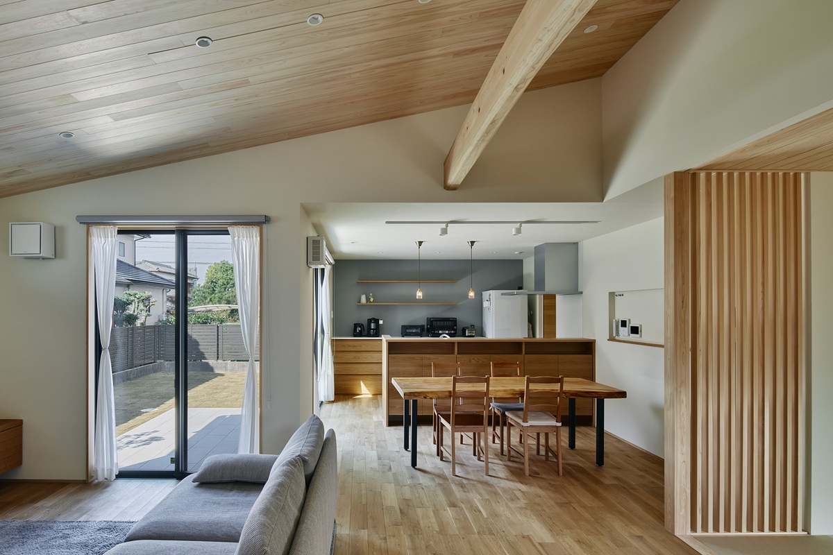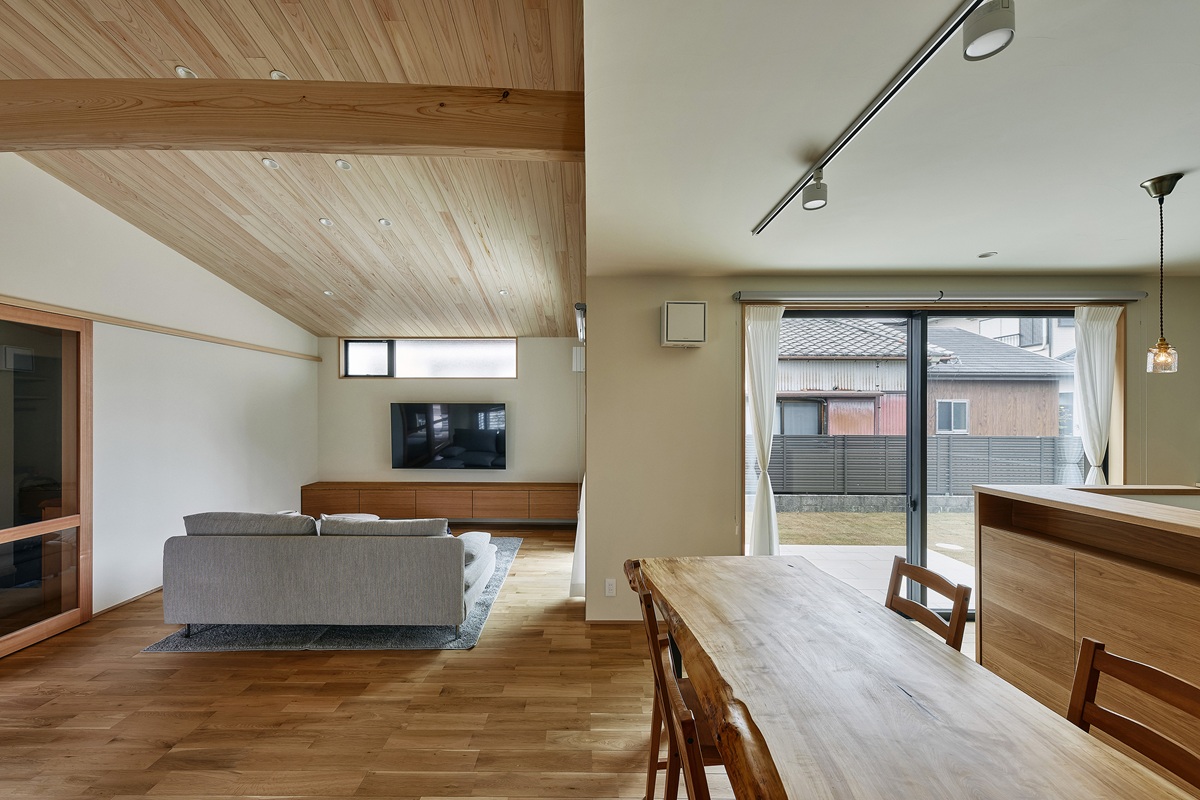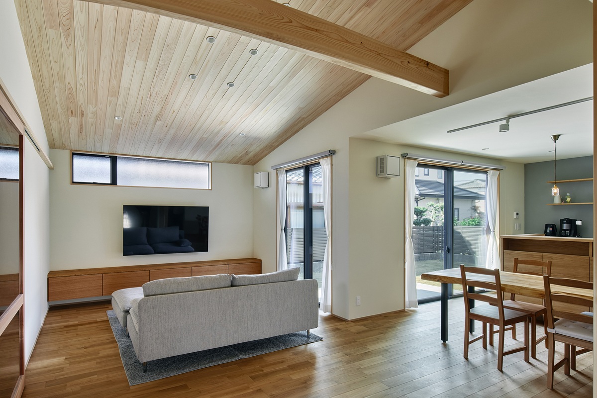 リビングとダイニングと2方向からテラスに面したL字型の広く明るいLDK。リビングの天井は板張りの勾配天井を採用し、太鼓梁が存在感を発揮します。キッチンカウンターやキッチンの背面収納なども、収納したいものに合わせてフィットするよう造作で仕上げています。本物の木を使っているため、肌触りや色味など、経年変化を楽しめるLDKです。