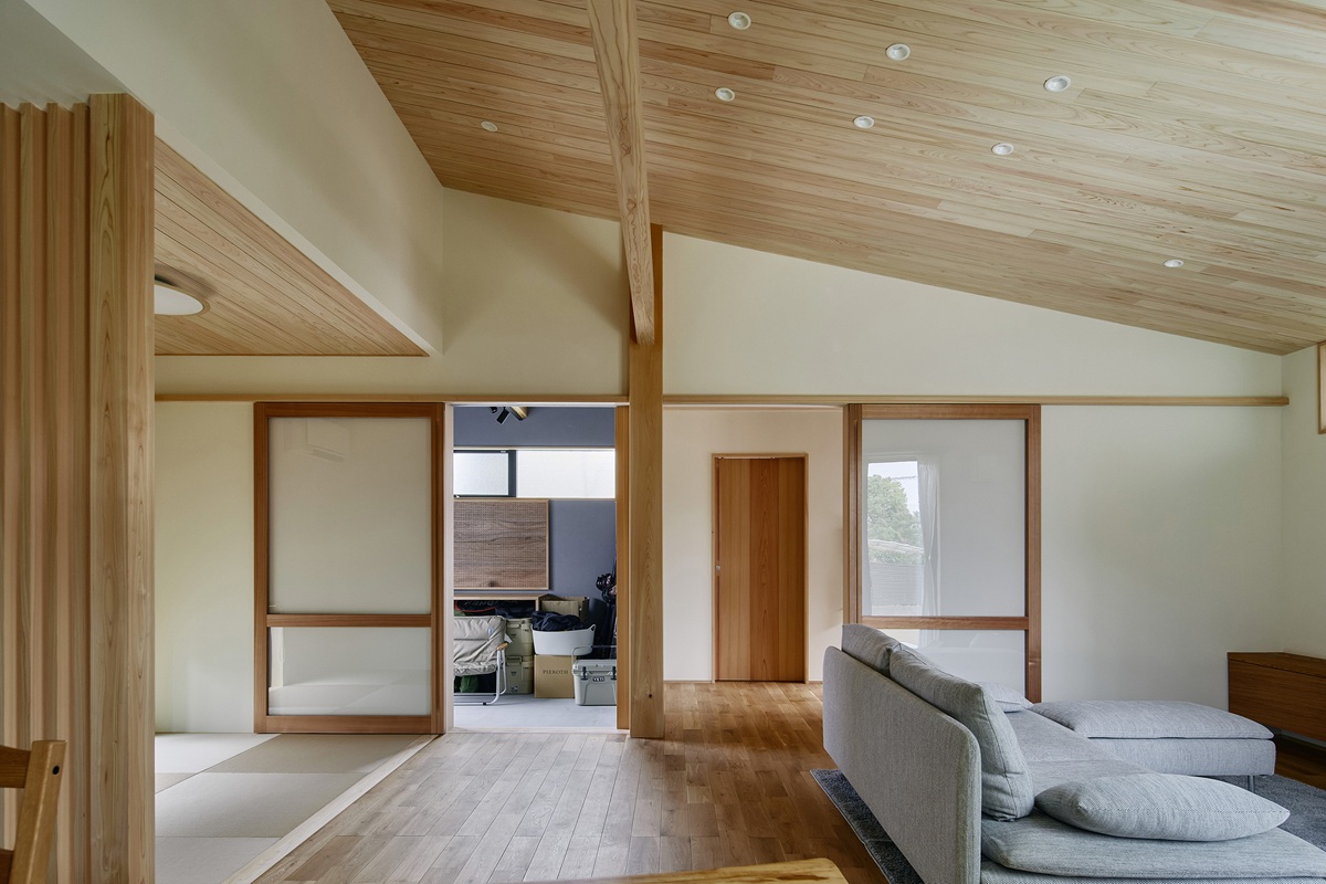 地窓から坪庭をながめられるリビングの一角に配した畳コーナー。ごろんと寝転んでくつろいだり、座卓を置いてお客様をもてなしたり、日常も非日常も演出できる空間です。リビングからはバイクガレージにもつながり、道具のお手入れや物の出し入れにも便利です。