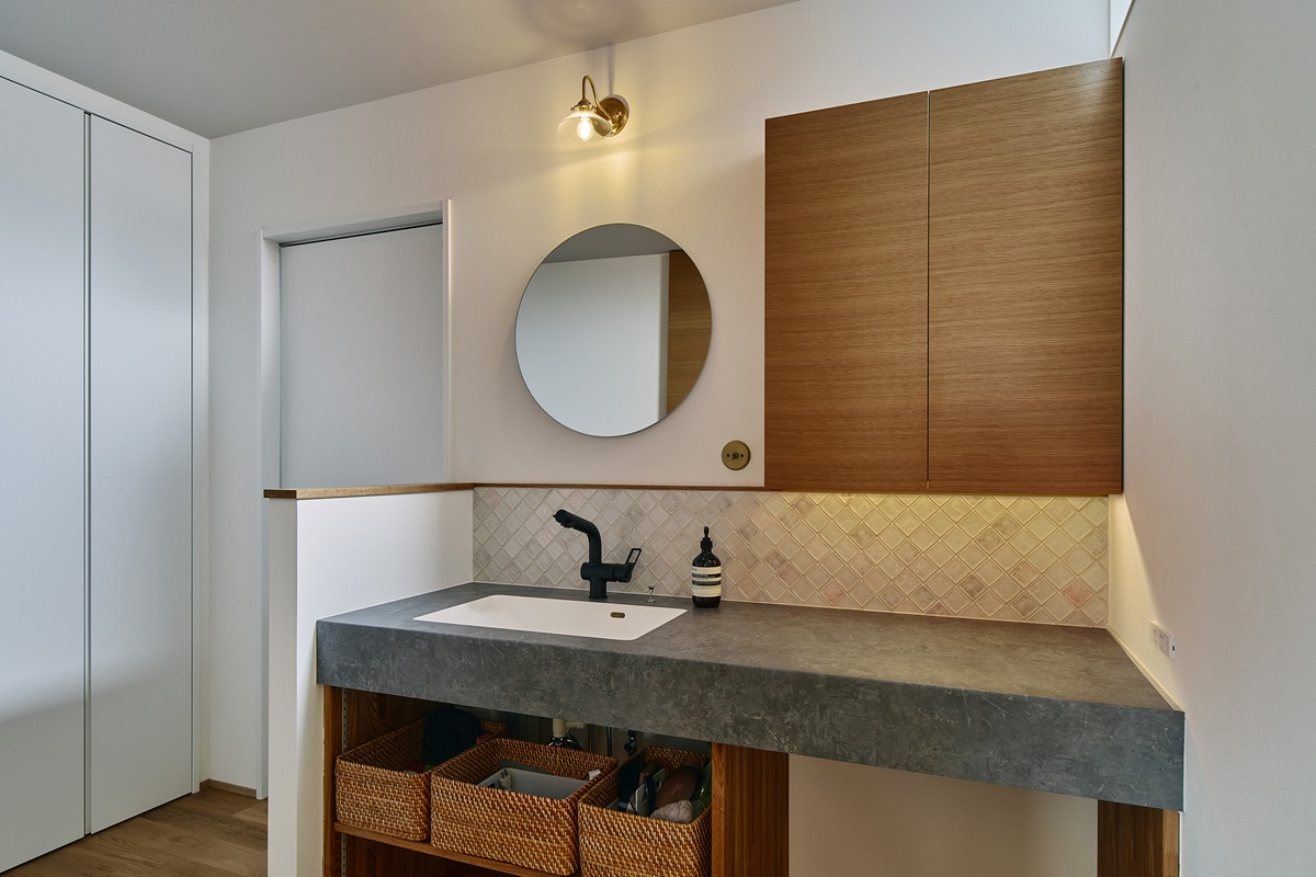 正面の丸いニッチは施主様のお気に入りで、旅先で出会ったもの、お子様が作ったもの、家族の思い出など、季節や気分に合わせて飾ることができ、暮らしのアクセントになります。